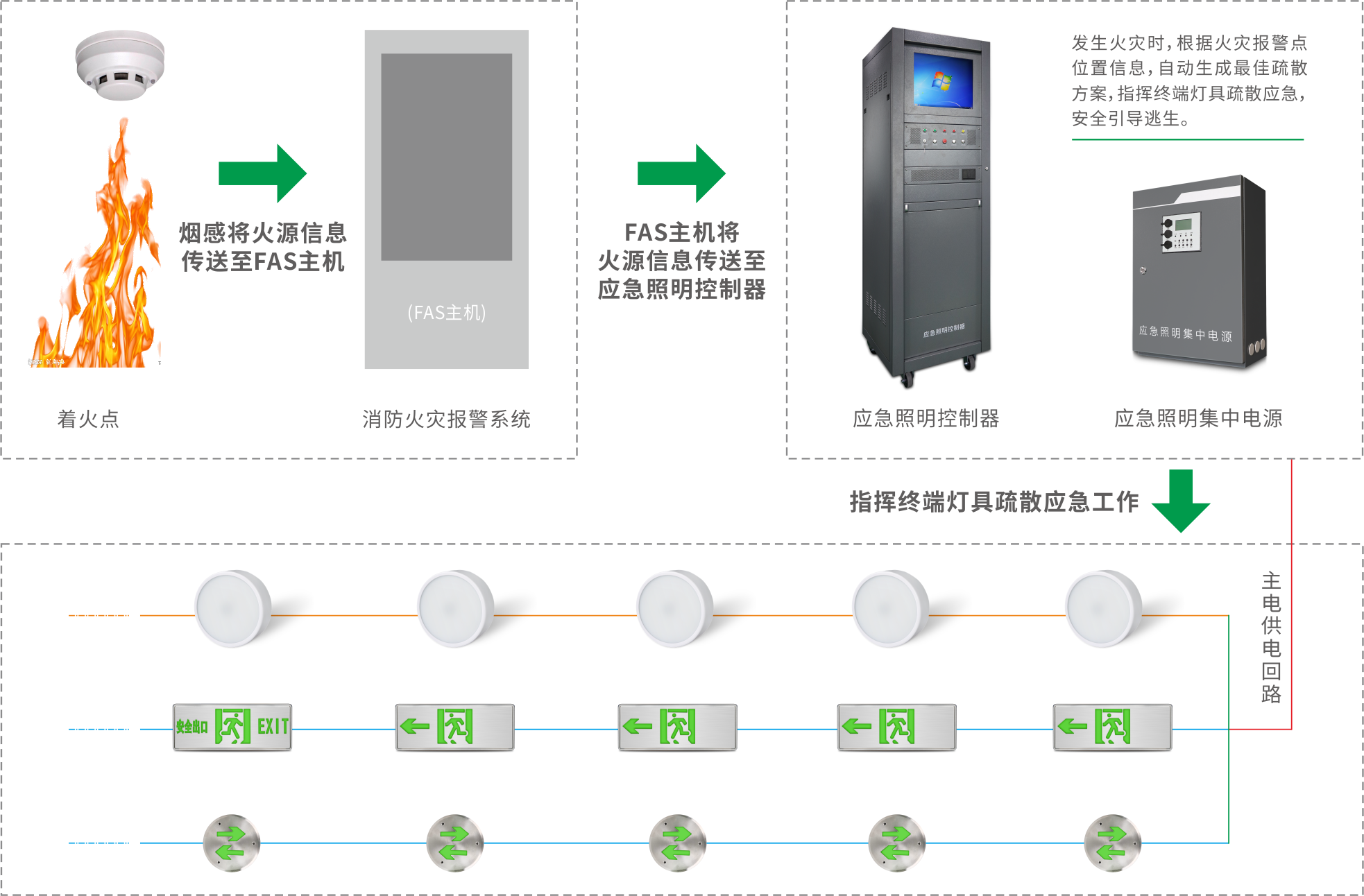 “智能疏散系統(tǒng)”是由智能疏散系統(tǒng)控制主機、消防應急電源、消防應急標志燈具、消防火災報警主機,火災探測器等多種設備組成的一套智能消防疏散系統(tǒng)。該系統(tǒng)具有人機交互界面,可對應急標志燈具實時巡檢、并與報警主機系統(tǒng)聯(lián)動、在有火災發(fā)生時,根據(jù)起火位置智能選擇最佳逃生路線進行疏散指示。